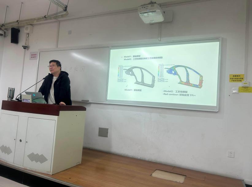 2025年11月3日,tyc41183太阳成集团邀请领益智造公司王斌技术主管走进《冲压工艺及模具》课堂,为材料成型及控制工程系2023级本科生带来了别开生面的冲压成形典型案例和个人成长经验体会的分享,开启了以“企业专家进校园”为主题的校企合作进行专业课程育人新模式尝试。在授课中王斌技术主管在为学生详细阐述了冲压实际生产情况及冲压生产特点,并结合自己在冲压领域的实际研究案例,还结合个人学习、工作经历,着重强调了冲压工艺在整个工业领域,尤其是汽车、航天及日常生活领域中的重要性,在课堂上和学生们积极进行互动交流和疑惑,为上课学生们提供了切实可行的专业知识学习和行业就业方面的指导,具体包括两部分内容: